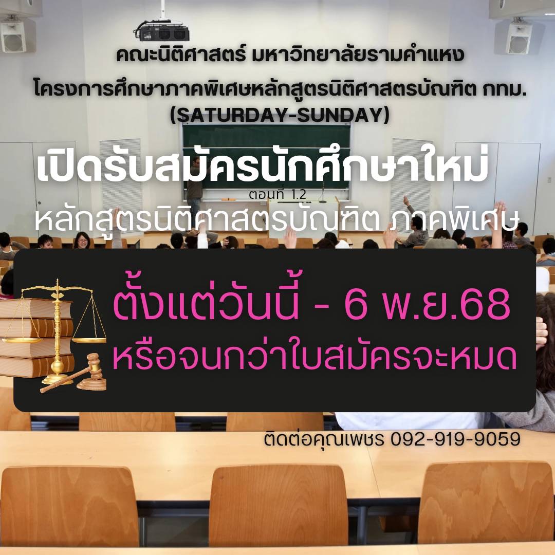 📍 สนใจซื้อใบสมัครได้ที่ คณะนิติศาสตร์ มหาวิทยาลัยรามคำแหง อาคาร 1 ชั้น 1 ห้อง 1110