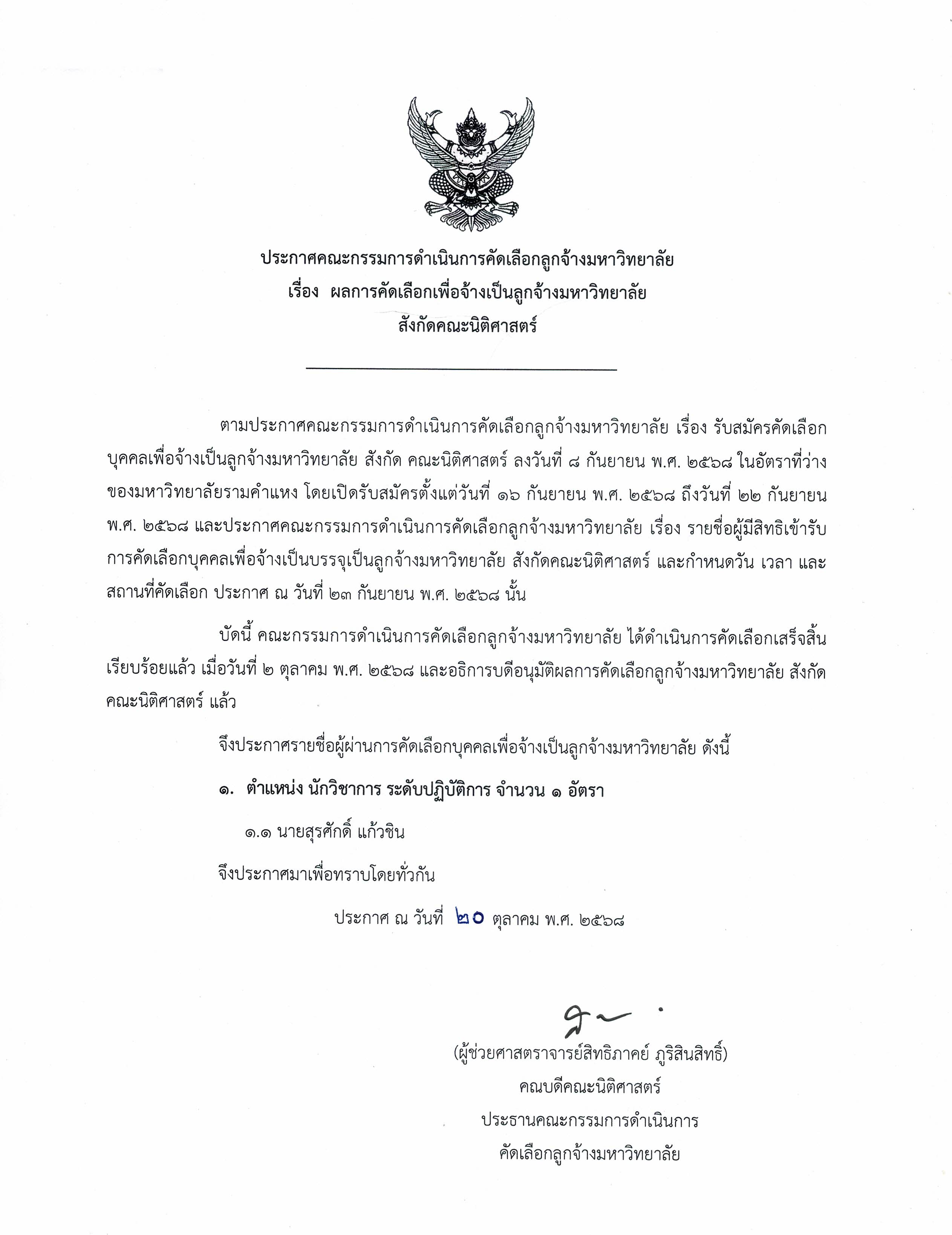 เรื่อง ผลการคัดเลือกเพื่อเป็นลูกจ้างมหาวิทยาลัยรามคำแหง สังกัดคณะนิติศาสตร์